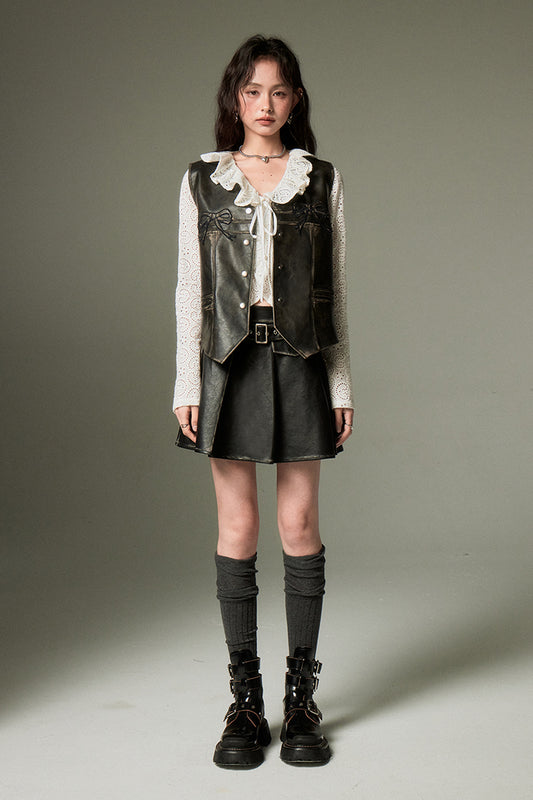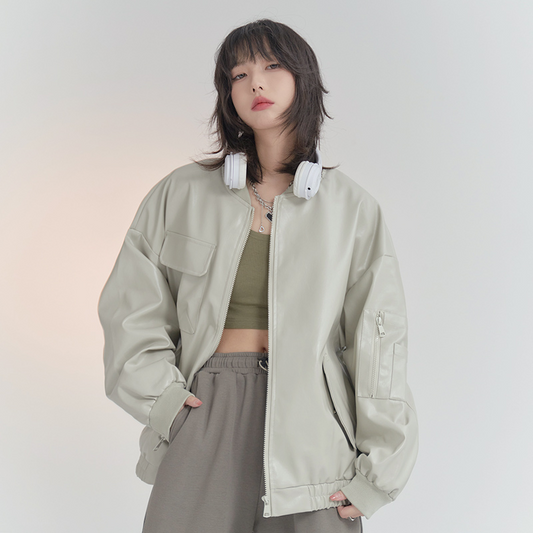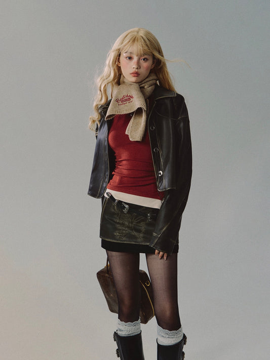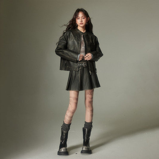 nu226 "Dust of Memory" retro tea-green leather short jacket