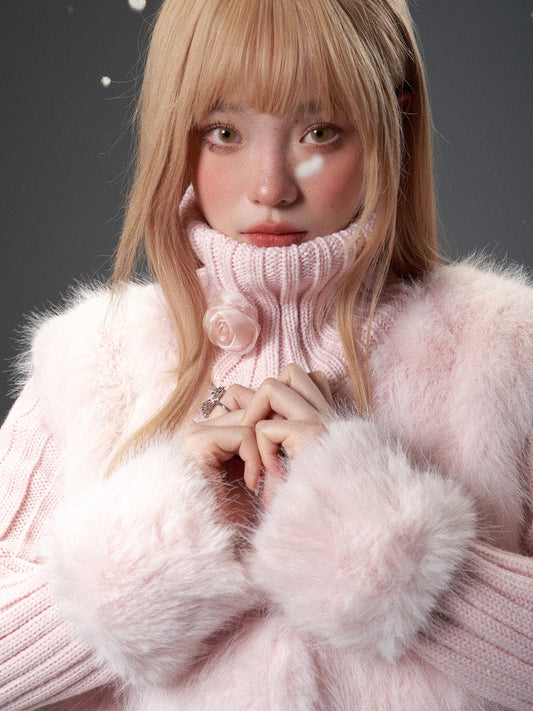 nu297 Pink knitted turtleneck detachable scarf fur vest jacket