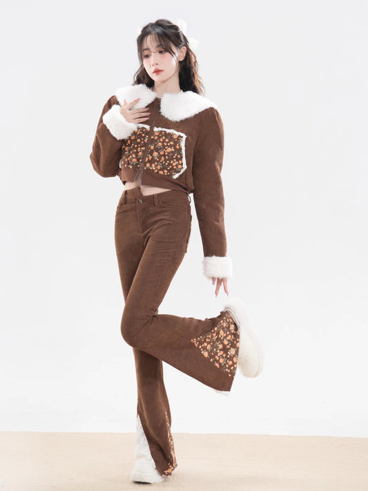nu282 Corduroy floral patchwork fur coat / slimming bell bottoms