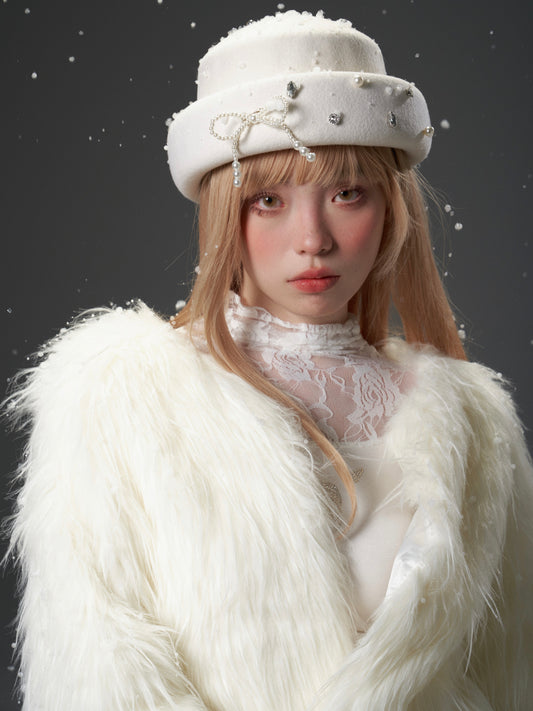 nu309 Bow pearl hand-stitched diamond woolen hat
