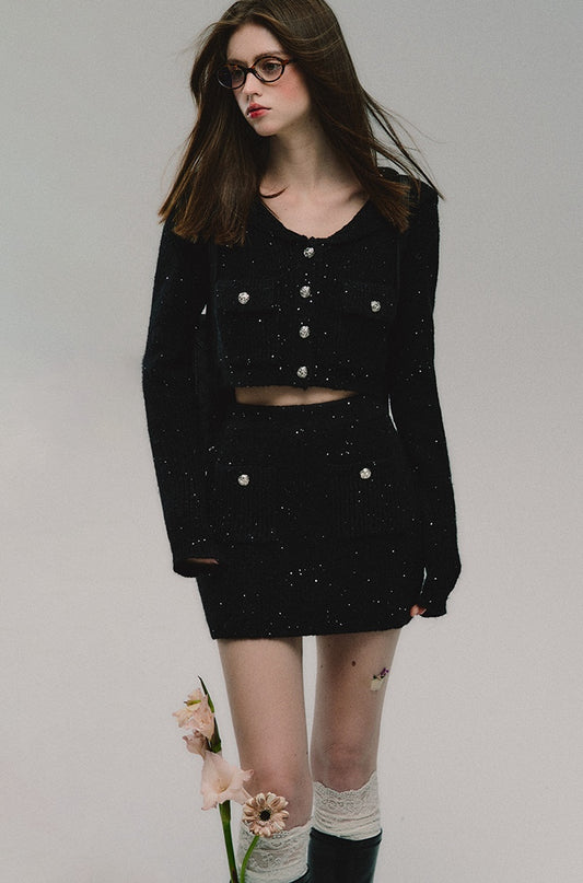 nu265 "Paris Night" Black Sequined Mohair Knitted Cardigan and Short Skirt