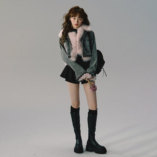 nu204 "Flexible Thorn" washed denim patchwork short jacket