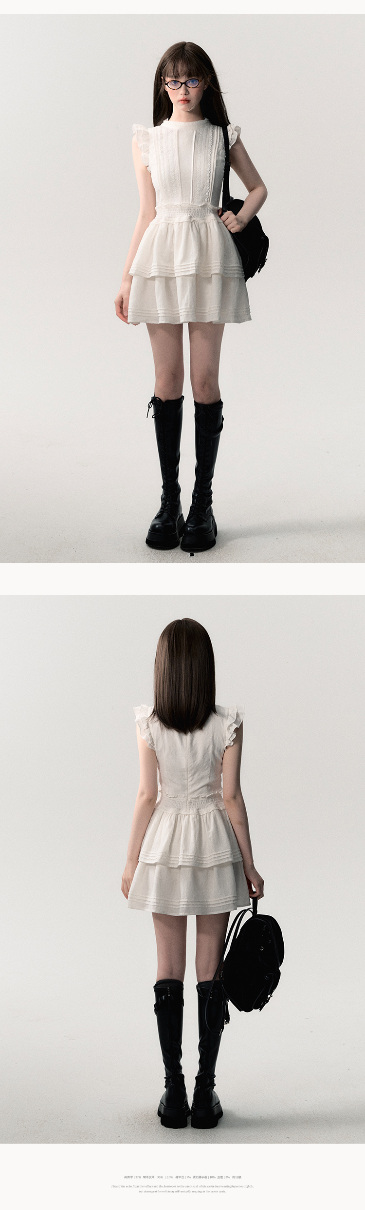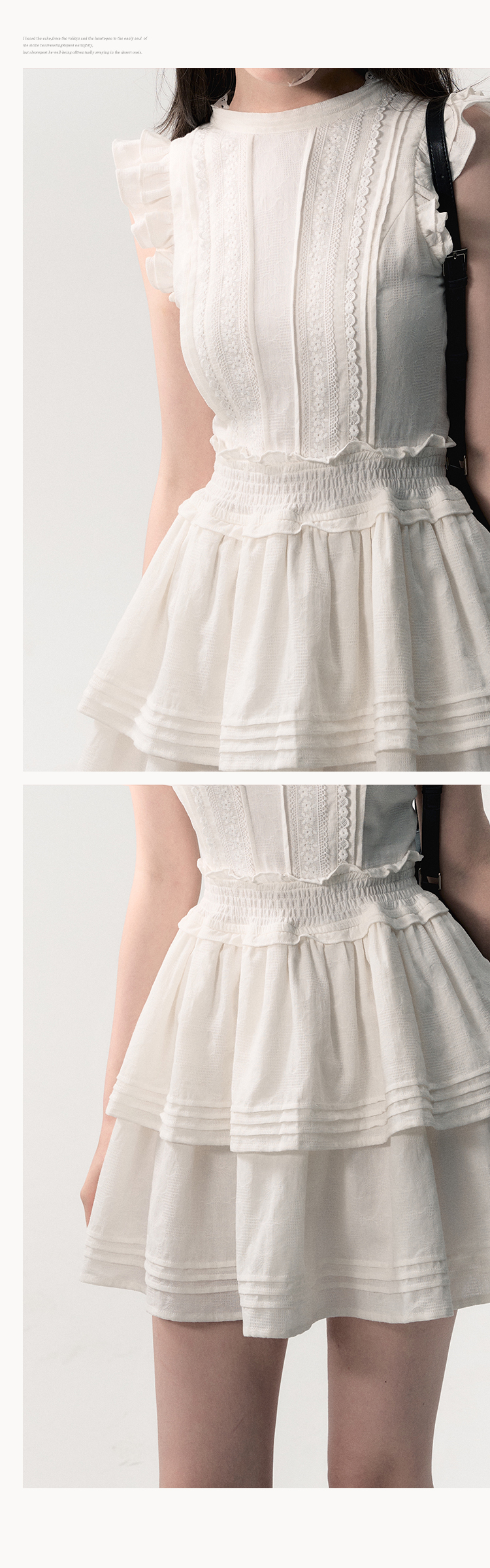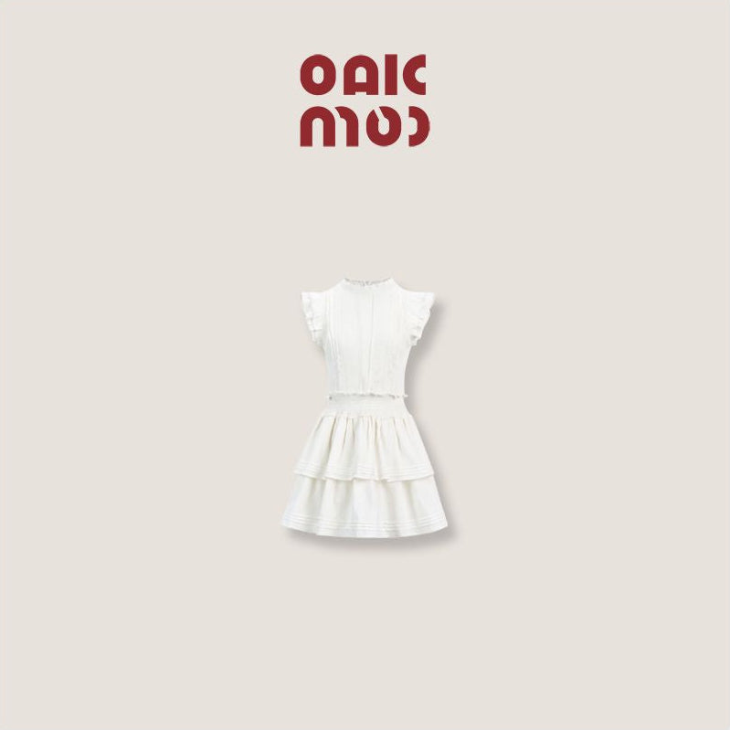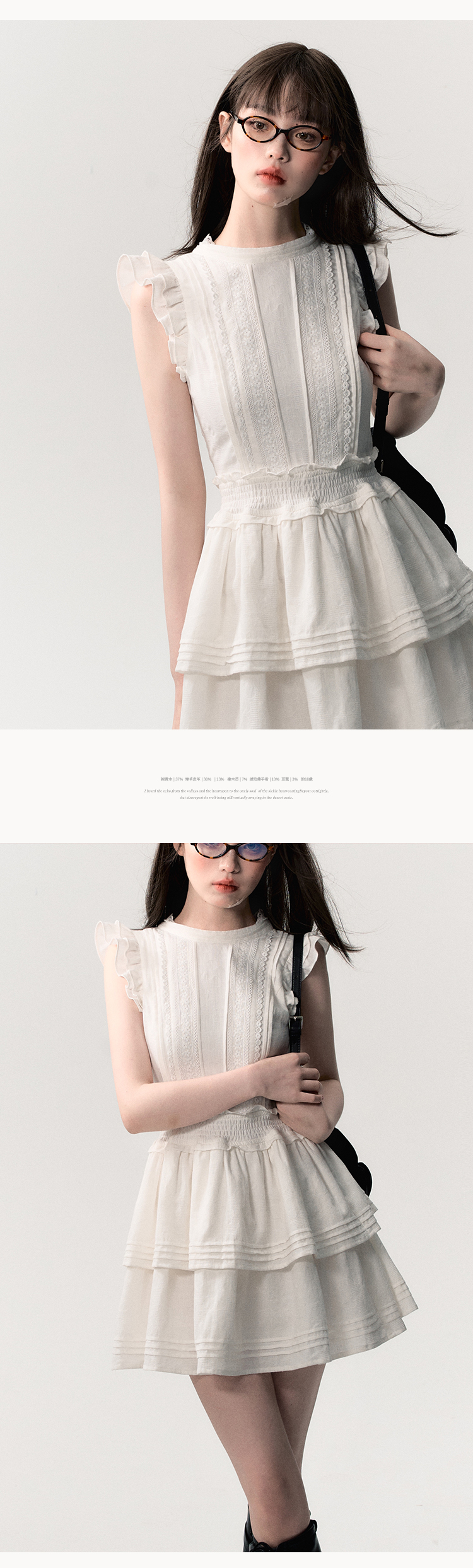 This dress is made from 100% cotton fabric with a full cotton jacquard pattern and features detailed smocking and pleating techniques. It offers a regular fit with no elasticity, soft texture, and medium thickness. The dress is fully lined and comes in a charming ivory white shade.